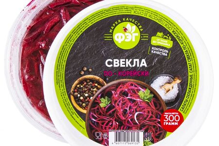 Свекла ФЭГ по-корейски 300г – пикантный салат, который добавит разнообразия в ваше меню. Изготовлен из отборной свеклы с добавлением чеснока, специй, пряностей и прочих ингредиентов. Полностью готов к употреблению. Свекла богата витаминами, минералами и природными антиоксидантами. В ее составе много клетчатки, которая обеспечивает комфортное пищеварение и помогает очистить организм от шлаков и токсинов. Яркая, в меру остренькая закуска станет украшением вашего стола как в будни, так и в праздники. После вскрытия упаковки продукт следует хранить в холодильнике. «ФерЭльГам» (ФЭГ) – это современная, динамично развивающаяся компания, которая контролирует качество своей продукции от поля до прилавка.