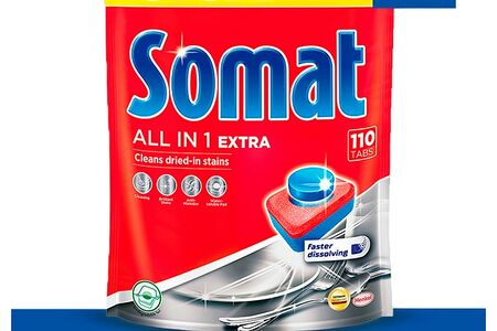 Таблетки для посудомоечной машины "Сомат All in 1 Extra" обеспечивают чистоту посуды и самой техники, а также блеск! Средство гарантирует полное очищение посуды, даже от присохшей еды и пригоревшего жира.