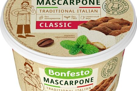 Сыр Bonfesto Маскарпоне 78% 500г - это классический мягкий сыр, который производится по итальянскому рецепту путем ультрафильтрации сливок. У него нежная кремообразная консистенция и сладко-сливочный вкус, который лучше всего проявляет себя в десертах. Традиционно маскарпоне используется для создания знаменитого Тирамису, сладких роллов из рисовой бумаги с фруктами, крема для тортов и блинчиков, десертных корзиночек с ягодами и порционных десертов в стаканчиках. Он хорошо намазывается, поэтому его используют также для приготовления закусочных бутербродов и канапе.