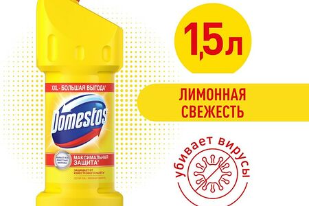 Средство чистящее Domestos Лимонная Свежесть с антисептическим эффектом 1.5л универсальный густой гель, который идеально подходит для поддержания чистоты во всем доме. Уникальная формула с мощным дезинфицирующим эффектом и чистящими компонентами уничтожает до 100% известных микробов, в том числе грибки, споры, бактерии и вирусы. Она эффективно удаляет даже самые сложные загрязнения, расщепляет известковый налет и предотвращает его повторное появление, нейтрализует неприятные запахи. В неразбавленном виде средство может использоваться для очищения и дезинфекции унитаза, ванны, раковины, стоков и сливов, а в разбавленном для мытья множества поверхностей (пола, кафеля, плитки, кухонных столешниц, мусорных ведер) и даже для отбеливания белья. Эргономичный флакон с изогнутым носиком-дозатором обеспечивает удобство в процессе использования. Защитите свой дом с помощью продукции ТМ Domestos!