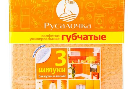 Салфетки Русалочка Универсальные губчатые 3шт предназначены для влажной уборки кухни и ванной комнаты. Целлюлозная основа армирована сеткой, что обеспечивает салфеткам особую прочность и наделяет их свойствами губки. Они отлично впитывают влагу, вытирают поверхность насухо и чисто, без разводов и ворсинок. Практичные, удобные, не оставляют после себя неприятного запаха. Для придания эластичности и сохранения потребительских качеств рекомендуется прополаскивать изделия до и после использования. В упаковке - 3 штуки.