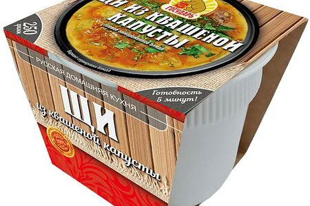 Сведения о составе: Вода питьевая, капуста квашеная (капуста белокочанная, морковь, соль), картофель, курица, морковь, лук репчатый, масло подсолнечное рафинированное, соль, чеснок, петрушка, лавровый лист, агент антислеживающий Е536Пищевая ценность: 63,2.4,4.8,2.5Условия хранения: -18,-18Срок годности в днях: 180Страна изготовления: РоссияСведения об упаковке: Картонная упаковка