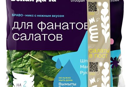 Смесь салатная Белая Дача Браво 50г – это идеальное дополнение к вашему рациону! В эту упаковку попадают только самые молодые листики шпината, мангольда и рукколы, которые бережно вырастили, собрали вручную, трижды промыли и тщательно просушили с применением современных технологий. Их можно использовать для приготовления салатов на основе свежих сезонных овощей, а также подавать в качестве гарнира к мясу и рыбе. Смесь идеально сочетается с сырами, лососем, авокадо, спаржей, киноа, томатами, цитрусовыми фруктами. Бэби-листочки не нарезают на производстве, благодаря чему они попадут к вам на стол максимально свежими. Продукция ТМ «Белая Дача» –это сочетание отменного вкуса, пользы и натуральности.