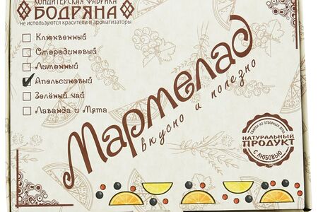 Сведения о составе: Сахар, вода питьевая, патока крахмальная карамельная, апельсины свежие (сок прямого отжима, цедра), желирущий агент пектин, регулятор кислотности - лимонная кислотаПищевая ценность: 303,0.4,0,75.5Условия хранения: 20,5Срок годности в днях: 90Страна изготовления: РоссияСведения об упаковке: Картонная коробкаПроизводитель: КФ Бодряна