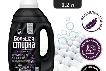 Гель для стирки Большая стирка Black 1.2кг – концентрированное гелеобразное средство, предназначенное для стирки черных и темных вещей. Его активная формула содержит комплекс 7 энзимов, который эффективно устраняет самые сложные пятна и загрязнения. Средство обеспечивает тканям насыщенный темный цвет без белых разводов, разглаживает тканевые волокна, предотвращает появление катышек, помогает сохранить первоначальную форму изделий, придает им свежий аромат. Подходит как для ручной, так и для машинной стирки. Полностью выполаскивается из белья в процессе полоскания. Гипоаллергенность подтверждена протоколом института им. Пастера. Такой флакон рассчитан примерно на 30 стирок.