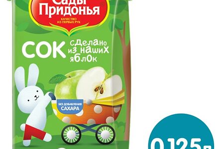 Сок Сады Придонья Яблоко прямого отжима 125мл - 100% натуральный продукт для детского питания, изготовленный из зеленых сортов яблок, выращенных в собственных хозяйствах компании. Рекомендуется давать детям с 4-месячного возраста, начиная с 0,5 чайной ложки 2 раза в день, постепенно увеличивая к 12 месяцам до 100 мл. Не содержит консервантов, красителей, ароматизаторов и ГМО. Удобно брать с собой на прогулку или в гости. Обратите внимание: перед введением нового продукта в рацион ребенка обязательно проконсультируйтесь с вашим педиатром!