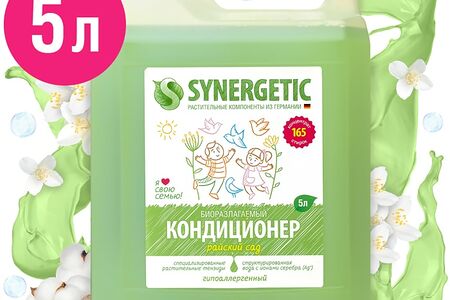 Кондиционер для белья Synergetic Райский сад 5л - экологичный и безопасный биоразлагаемый ополаскиватель. Благодаря содержанию натуральных и растительных компонентов он на 100% выполаскивается, бережно ухаживает за всеми видами тканей и придает белью особую мягкость. Обладает антистатическим эффектом и облегчает глажение. Для придания нежного зеленого оттенка при производстве используется низкая концентрация пищевого красителя. Эфирные масла жасмина, пачули, розы, нероли и ветивера составляют букет легкого аромата цветущего сада. Средство имеет сертификат международного этического и экологического института сертификации ICEA. Гипоаллергенно, подходит для детей, домашних животных и людей с чувствительной кожей. Экономичная упаковка из перерабатываемого пластика оборудована складным носиком, что облегчает наливание.