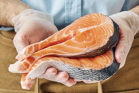 Семга стейк охлажденный Премиум – свежайшая красная рыба премиального качества. Ее выращивают в идеально чистых водах Баренцева моря и кормят исключительно натуральными кормами. Целые тушки разделывают в специально оборудованном холодном цеху непосредственно в день вашего заказа. Аккуратно нарезанные стейки помещают в вакуумные упаковки, чтобы сохранить максимальную свежесть продукта во время транспортировки. Семга очень полезна для организма: она благотворно влияет на работу сердца и головного мозга, укрепляет кровеносные сосуды, оказывает положительное воздействие на нервную систему и опорно-двигательный аппарат, нормализует обмен веществ, служит источником белка и жирных кислот Омега-3. После получения товара рекомендуется достать стейки из упаковки.