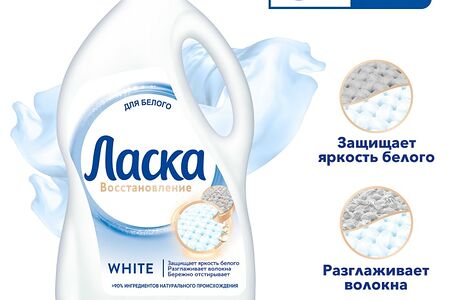 Гель для стирки "Ласка Восстановление White" для белого белья. Жидкий порошок "Ласка Восстановление White" для белого эффективно и бережно отстирывает загрязнения на одежде и белье. Формула содержит специальный оптический отбеливатель, благодаря чему средство "Ласка" восстанавливает и сохраняет белизну вещей, предотвращая появление серого оттенка. Активные компоненты способствуют уменьшению количества катышков на ткани и сохраняют прочность волокон ткани. В результате регулярного использования средства для стирки "Ласка" поверхность ткани становится более гладкой. Преимущества геля для стирки "Ласка": бережно и эффективно отстирывает загрязнения. Восстанавливает и защищает яркость белого цвета. Сохраняет форму ткани и препятствует появлению катышков. Не оставляет разводов на одежде. Гель Laska удобен в использовании: дозируйте жидкое средство согласно инструкции, заливайте его в отделение для стирального порошка или добавьте мерный колпачок со средством для стирки в барабан стиральной машины.