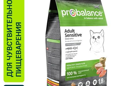 Полнорационный сбалансированный сухой корм премиум-класса для кошек с чувствительным пищеварением и склонных к аллергии. Корм рекомендован для ежедневного кормления взрослых кошек всех пород. Сухой корм Probalance Sensitive разработан практикующими датскими ветеринарами. Состав корма подобран таким образом, чтобы он подходил для животных с чувствительным пищеварением и одновременно удовлетворял их потребности в питательных веществах, витаминах и минералах. Основные компоненты и их польза: натуральный белок из мяса домашней птицы нормализует обмен веществ и рост мышечной ткани. Растительная клетчатка необходима для формирования полезной кишечной микрофлоры и облегчения пищеварения. Рис оказывает благоприятное воздействие на слизистую оболочку кишечника. Пищевые волокна стимулируют моторику кишечника. Витамин А нужен для укрепления иммунитета и повышения сопротивляемости организма стрессовым ситуациям и болезням. Таурин — для активной работы сердца и остроты зрения. Йод — для активизации функций щитовидной железы. Размер гранулы: диаметр — 10 мм, толщина — 5 мм, форма — круг.
