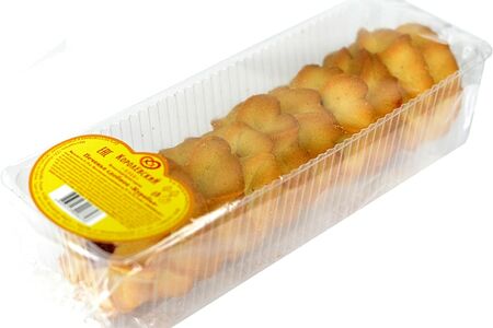 Сведения о составе: Мука пшеничная хлебопекарная высшего сорта, маргарин с м.д.ж. не менее 82 % (рафинированные дезодорированные масла в натуральном и модифицированном виде (пальмовое масло и его фракции, подсолнечное масло), вода, эмульгаторы (Е471, Е475), соль поваренная пищевая, ароматизатор «Сливки-молоко», краситель Е 160а, регулятор кислотности лимонная кислота), сахар, джем клубничный (пюре клубничное, сахар, сироп глюкозно-фруктозный, яблочное пюре, вода, загуститель–пектин, регулятор кислотности лимонная кислота, ароматизатор «клубника», консервант сорбиновая кислота, краситель Е120), вода питьевая, комплексная пищевая добавка (мука пшеничная, разрыхлители: гидрокарбонат натрия, дигидропирофосфат натрия; крахмал кукурузный, агент антислеживающий - карбонат кальция), разрыхлитель натрий двууглекислый, соль поваренная пищевая, регулятор кислотности лимонная кислотаПищевая ценность: 510,5.5,28,59Срок годности в днях: 90Страна изготовления: РоссияСведения об упаковке: Пластиковый контейнерПроизводитель: ООО Калининградхлеб