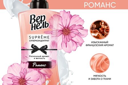 Концентрированный кондиционер для белья "Вернель Супрэм Романс" 1200 мл (40 стирок) создан совместно с французскими парфюмерами и обладает элегантным сочетанием аромата роз, белых цветов и цитрусовых нот, которые придадут изысканный аромат вашему белью. Кондиционер для стирки содержит миллионы разглаживающих частиц для роскошной мягкости и заботы о ткани. Вместе с кондиционером для белья "Вернель Супрэм Романс" окутайте себя изысканным французским ароматом и перенеситесь в атмосферу Парижа. Преимущества кондиционера для белья "Вернель": средство "Вернель" имеет уникальную Creme-care формулу, обеспечивающую мягкость белью. Благодаря специальным аромакапсулам в составе кондиционер дарит элегантное сочетание цветочных ароматов. Кондиционер для стирки облегчает глажку и обладает антистатическим эффектом. Кондиционер "Вернель" идеально подходит для регулярного ухода за бельем благодаря эффективности и простоте использования. На одну стирку достаточно меньше половины колпачка средства "Вернель".