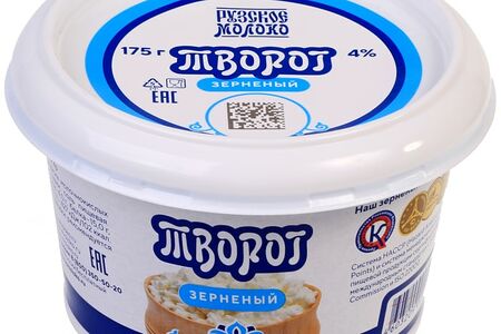 Творог зерненый Рузский 4% 175г натуральный рассыпчатый творог для здорового питания (в том числе и детского) и приготовления домашних творожных блюд. Производитель позаботился о том, чтобы при изготовлении творога были соблюдены высочайшие стандарты качества, и выбрал закрытый способ производства. Это значит, что творог созревает на закрытой линии, не допускающей контакта продукта с внешней средой, под контролем опытных специалистов. Такой творог получается очень сливочным и свежим на вкус, но главное, этот метод не допускает попадания в продукт кишечной палочки и других болезнетворных бактерий. Вместе с тем в нем сохраняются все полезные микроэлементы и витамины.