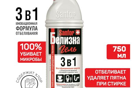 Средство чистящее Sanfor Белизна гель 3в1 Многофункциональное 700г прекрасно подойдет для прочистки труб, удаления ржавчины на поверхности унитаза, отбеливания белья и одежды, мытья и дезинфекции полов. Благодаря мощной инновационной формуле с хлором оно эффективно справляется с грязью, плесенью, известковым налетом, микробами и пятнами на тканях, а также устраняет неприятные запахи. Густая гелеобразная консистенция обеспечивает экономичный расход. Флакон имеет антискользящую поверхность, благодаря чему не выскользнет даже из мокрых рук. Косое горлышко позволяет без труда наносить гель в труднодоступные места (к примеру, под ободок унитаза).