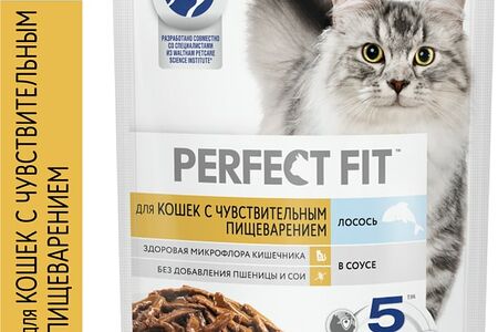 Влажный корм для кошек Perfect Fit полнорационный для чувствительного пищеварения с лососем в соусе 75г доставка
