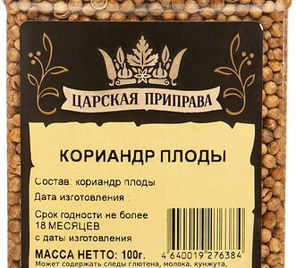 Кориандр Царская приправа плоды 100г – 100% натуральная специя, обладающая благородным пряным ароматом и едва ощутимым пикантным вкусом. Растение кориандр относится к семейству Зонтичные. В пищу употребляют не только его плоды, но и листья – в народе их принято называть кинзой. Яйцевидно-шаровидные семечки кориандра включают в состав желчегонного и желудочного сборов, а также используют для ароматизации колбас, мясных и рыбных консервов, хлеба, маринадов, некоторых сортов пива. Молоть их рекомендуется непосредственно перед использованием, ведь, чем свежее помол, тем ярче аромат. Упаковка – удобная баночка с крышкой.