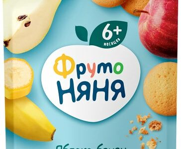 Пюре ФрутоНяня из яблок с бананом грушей и печеньем 90г отлично подойдет для легкого перекуса. Поможет разнообразить меню деток старше 6 месяцев. В состав входят не только фрукты, но и ароматное печенье. Продукт способствует нормальному пищеварению, так как служит источником клетчатки. Удобная упаковка разработана специально для того, чтобы ее можно было взять с собой. Для кормления не потребуется ложка, ведь кроха сможет кушать самостоятельно под присмотром взрослых. А еще можно копить разноцветные Фрутокрышки, которые соединяются между собой как детали конструктора, и играть с родителями в увлекательные игры!