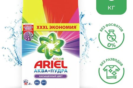 Стиральный порошок Ariel Аквапудра Color автомат 40 стирок 6кг растворяется, едва коснувшись воды, и моментально активируется: удаляет трудновыводимые пятна, глубоко проникая в структуру волокон, и не дает загрязнениям въедаться. Порошок устраняет загрязнения, вызывающие неприятные запахи, такие как запах пота и тела, придавая одежде приятный аромат и сияющую чистоту даже на воротничках и манжетах рубашек.