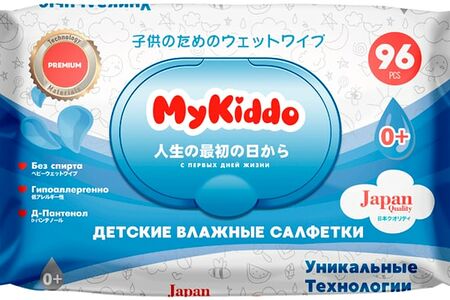 Салфетки влажные MyKiddo детские с пантенолом 96шт прекрасно подойдут для ухода за детьми с первых дней жизни. Произведены из гипоаллергенных материалов с применением передовых японских технологий. В качестве пропитки используется бесспиртовой лосьон с Д-пантенолом. Салфетки легко и бережно удаляют загрязнения, а также увлажняют и смягчают чувствительную кожу малышей, предупреждают возникновение сухости и раздражения, нормализуют естественные защитные функции кожного покрова. Они удобны в применении, идеально подходят для использования в дороге. Плотный клапан надежно закрывает упаковку и предотвращает преждевременное высыхание салфеток.