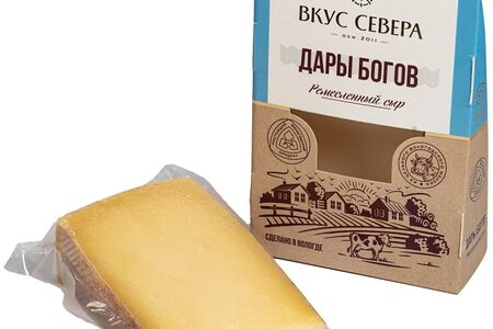Твердый сыр «Дары богов» созревает более 5 месяцев, изготавливается по технологии альпийского сыра из цельного коровьего молока, без использования растительных жиров, трансжиров и заменителей молочного жира. Имеет плотную твердую консистенцию. Вкус ярко выраженный, благородный, сладковатый, с фруктовыми нотками на послевкусие. В процессе созревания сыр натирается специальным раствором из культур, которые придают головке сыра красивый ремесленный оттенок. Это наиболее концентрированный источник ключевых питательных веществ: протеина, жира, витаминов группы А, B и D, а также кальция.