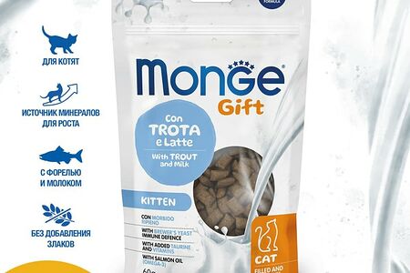 Лакомство для котят Monge Gift Kitten Хрустящие подушечки с форелью и молоком 60г доставка