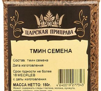 Тмин Царская приправа семена 150г – 100% натуральная специя, обладающая пикантным, слегка жгучим вкусом и насыщенным пряным ароматом. Растение тмин относится к семейству Зонтичные. Семена его широко используются для ароматизации хлебопекарных изделий, в кулинарии, кондитерском и ликеро-водочном производстве. Они хорошо дополняют вкус рыбы, мяса, грибов, картофеля, капусты, свежих овощей, бобовых, круп и макарон. Тмин возбуждает аппетит и улучшает пищеварение, поэтому его часто кладут в жирные мясные блюда (например, в свинину, баранину, домашнее сало). Приправа гармонично сочетается с анисом, фенхелем и кориандром. Упаковка – удобная баночка с крышкой.
