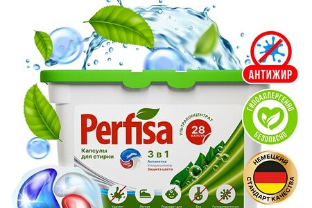Капсулы для стирки Perfisa 3в1 ультраконцентрированные 28шт - гипоаллергенное средство, созданное для безупречного результата. Они профессионально отстирают пятна пота, крови, яиц, молочных и мясных продуктов. «Анти-жир» и энзимы делают их особенно эффективными против пятен растительного и животного происхождения: подсолнечного, сливочного масла, куриного жира. Одобрены дерматологами: безопасны для нежной кожи, подходят для стирки детской одежды и игрушек. Безопасны для септиков и экологически значимых мест. Обладают антистатическим эффектом, препятствуют образованию катышек, сохраняют цвета яркими и сочными. Не содержат агрессивных компонентов, фосфатов, хлора и парабенов. Растворяются даже в прохладной воде от 30°C. Выполаскиваются из ткани, не оставляя разводов и следов на одежде. Эффективны на коротких режимах стирки от 40 минут. Удаляют неприятные запахи и дарят белью приятный аромат «Океанская свежесть». Одна капсула «3 в 1» рассчитана на 5 кг белья.