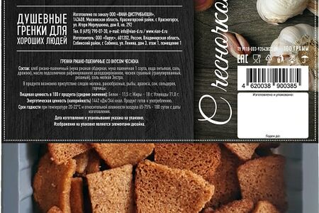 Сведения о составе: Хлеб ржано-пшеничный (мука ржаная обдирная, мука пшеничная 1 сорта, вода питьевая, соль, дрожжи), масло подсолнечное рафинированное дезодорированное, чеснок сушеный (гранулированный, резаный), соль мелкая Экстра. В продукте возможно присутствие следов молока, ракообразных, рыбы, арахиса, сои, сельдерея, горчицыПищевая ценность: 346,11.5,18,71Срок годности в днях: 180Страна изготовления: РоссияСведения об упаковке: ЛотокПроизводитель: Парус