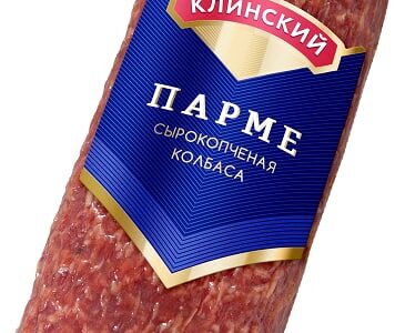 Колбаса Клинский Парме сырокопченая 360г приготовлена по оригинальному рецепту из отборной свинины с добавлением нежной свиной грудинки. Срез мелкозернистый, аппетитного бордового цвета, с вкраплениями мелкого шпика. Вкус пикантный, в меру соленый. Отличный выбор для праздничного застолья или фуршета. Вся продукция Клинского мясоперерабатывающего комбината проходит тщательный контроль качества на всех этапах производства, готовится из отборных натуральных ингредиентов по рецептам ГОСТ или авторским рецептам местных технологов.