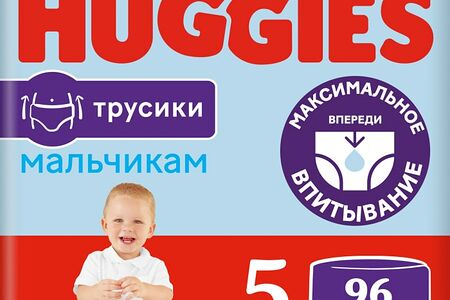 Подгузники трусики Huggies для мальчиков 12-17кг 5 размер 96шт с новыми героями, липучкой-утилизатором и усиленным впитывающим слоем созданы с использованием новейших азиатских материалов и технологий. В них вашему малышу будет комфортно и свободно, ничто не стеснит движения. Трусики-подгузники стали еще лучше и надежнее благодаря увеличенному впитывающему слою. Дополнительный сверхмягкий слой на пояске обеспечивает комфортную и эластичную посадку с меньшим давлением на животик, снижая риск появления красных следов на коже ребенка. В течение дня поясок адаптируется к меняющимся размерам животика, нежно обнимая его. Специальный впитывающий слой DryTouch расположен с учетом анатомических особенностей мальчиков (смещен вперед), он впитывает влагу за секунды, не образуя комок между ножек, и сохраняет кожу сухой днем и ночью. Мягкие эластичные резиночки вокруг ножек обеспечивают дополнительную защиту от протекания. Легко надеть — просто натяните трусики, легко снять — разорвите боковой шов. Липучка-утилизатор закроет запах на замок. Индикатор влаги подскажет, когда придет время сменить трусики. 2 замечательных новых дизайна в одной упаковке. Трусики не содержат отдушек, хлора и латекса для лучшей заботы о коже вашего активного мальчика и о природе.