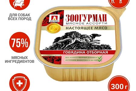 Влажный корм для собак Зоогурман Мясное ассорти Говядина отборная 300г - это высококачественное питание для взрослых собак всех пород. В его основе лежит 100% говядина и субпродукты, которые обеспечивают ежедневную потребность вашего питомца в белке. Благодаря правильно сбалансированному составу корм обеспечит собаке необходимый набор макро- и микроэлементов, аминокислот и минералов. Он придает животному энергию, укрепляет иммунную систему, делает шерсть блестящей и шелковистой, а кости и суставы крепкими. Не содержит сою, ГМО, искусственные красители, усилители вкуса, мясокостную и перьевую муку. Суточная норма кормления: 25-35 гр корма на 1 кг веса собаки.