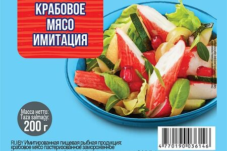 Сведения о составе: Сурими (фарш рыбный из вида рыб: желтополосая сардинелла, тумбиль, из семейства рыб: нитеперые, влагоудерживающий агент: полифосфаты), вода, крахмал пшеничный, крахмал кукурузный, масло растительное, загустители (дикрахмалфосфат, конжак), ароматизаторы, сахар, соль, белок яичный, стабилизатор, каррагинан, красители (кармины, экстракт паприки, диоксид титана)Пищевая ценность: 105,6.34,0.1,19.7Условия хранения: -18Срок годности в днях: 547Страна изготовления: РоссияСведения об упаковке: Вакуумная упаковкаПроизводитель: Вичюнай Русь