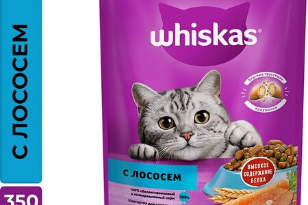 Сухой корм для кошек Whiskas Вкусные подушечки с паштетом Обед с лососем 350г - это готовый продукт с аппетитной хрустящей корочкой и нежной начинкой внутри. Созданный специально для взрослых кошек и котов (от 1 года), этот корм содержит оптимальную комбинацию витаминов, минералов и питательных веществ, необходимых для поддержания здоровья и красоты вашего любимца. Витамин Е защитит иммунитет, кальций и фосфор позаботятся о крепости костей и зубов, витамин А и таурин о хорошем зрении, а клетчатка - о пищеварении. Омега-6 и цинк помогут котику не болеть и сделают его шерсть пушистой и мягкой. Сухая текстура корма способствует удалению зубного налета.