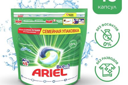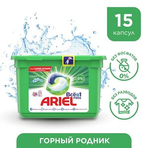 Капсулы для стирки Ariel Pods Все-в-1 Горный родник 45шт имеют уникальный многосекционный дизайн, позволяющий надежно сохранять компоненты в отдельных секциях капсулы до начала стирки, и обладают высококонцентрированными очищающими свойствами. Инновационная пленка капсул для стирки Ariel полностью растворяется при контакте с водой, позволяя мощным технологиям удалять различные виды пятен. Одна капсула содержит необходимую для стирки дозу лучшего жидкого средства от Ariel для сияющей белизны вашего белья. Благодаря уникальным технологиям и природным энзимам в составе Ariel Всё в 1 прекрасно отстирывает сложные пятна даже при температуре 20°C. Не содержат кондиционер для белья. Все активные компоненты полностью биоразлагаемы.