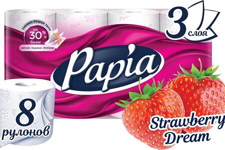 Бумага туалетная Papia "Клубничная мечта", 3 слоя, 8 рулонов. Ароматизированная трехслойная туалетная бумага Papia "Клубничная мечта" с цветным тиснением и перфорацией. "Клубничная мечта" — нежный фруктовый аромат, который подарит вам наслаждение. Уникальная технология двустороннего тиснения бумаги обеспечивает лучшую впитываемость и мягкость с обеих сторон. Теперь содержит экстракт хлопка. Обновленная Papia — выбор тех, кто всегда стремится к большему. Благодаря новой инновационной технологии Termo Power Tech теперь еще более мягкая, пышная и прочная.