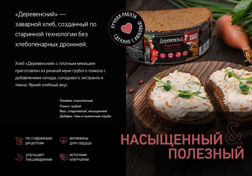 Хлеб бездрожжевой Рижский Хлеб Деревенский 220г приготовлен по старинным рецептам из ржаной муки грубого помола с добавлением пшеничной муки, солода и тмина. Многоступенчатый процесс производства начинается с ошпаривания муки и выдерживания в осиновых кадках ручной работы. Готовое тесто формуется увлажненными в теплой воде руками, а затем выкладывается на осиновые дощечки, присыпанные отрубями. При таком способе приготовления в хлебе образуются натуральные ферменты и витамины, которые улучшают работу органов пищеварения и общее самочувствие. Клетчатка, содержащаяся в муке грубого помола, помогает очистить кишечник и вывести токсины. Нарезан на ломтики, удобно подавать к столу и употреблять вне дома (на работе, в дороге или на пикнике).