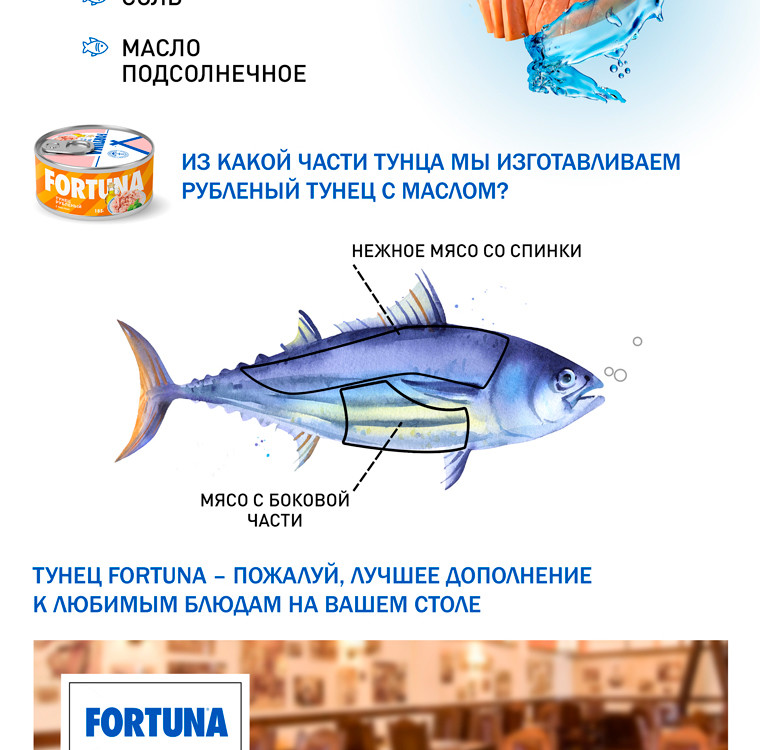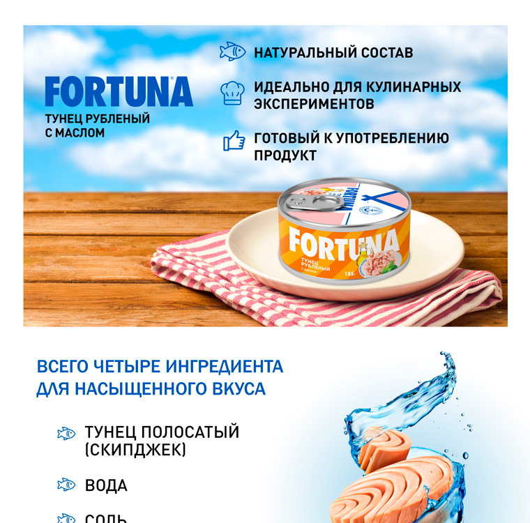 Тунец Fortuna рубленый в масле 185г приготовлен из свежей рыбы, выловленной в условиях дикой природы (Таиланд). Это филе аппетитного розового цвета без кожи и костей, разобранное на мелкие волокна, в небольшом количестве подсолнечного масла. Тунец - низкокалорийный диетический продукт с высоким содержанием белка, редких витаминов, аминокислот и полиненасыщенных жирных кислот Омега-3. В нем практически нет жира и совсем отсутствуют углеводы. Тунец - отличный ингредиент для салатов, закусок и бутербродов. Продукт стерилизованный, 100% натуральный, не содержит искусственных добавок и консервантов. Упакован в жестяную банку с ключом на крышке.
