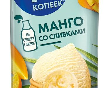 Мороженое 48 Копеек в вафельном стаканчике Манго со сливками 160мл – изумительное сочетание сливочного мороженого и освежающего сорбета с кусочками спелого манго. Производится на основе натуральных ингредиентов: цельного коровьего молока, свежих сливок, сливочного масла, пшеничной муки. Мороженое обладает нежной, слегка маслянистой текстурой. Стаканчик – крепкий и хрустящий, по мере таяния мороженого слегка размягчается. Продукт не содержит растительных жиров. Упаковка – герметичный пакетик.