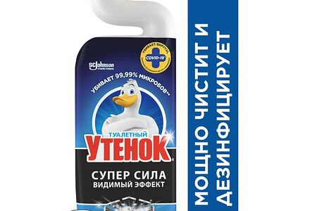 Чистящее средство для унитазов "Туалетный Утенок Гель Супер сила Видимый эффект", 500 мл. Суперэффективная формула чистящего средства для унитаза "Туалетный Утенок Видимый эффект" справляется с самыми сложными проблемами: удаляет стойкие пятна, включая ржавчину и 100% известкового налета, эффективна даже под водой. Убивает 99,99% микробов, включая вирусы, аналогичные по устойчивости SARS-COV-2, вызывающему COVID-19. Гель меняет цвет во время очищения, а значит, вы можете видеть, как он работает! Благодаря уникальной форме горлышка бутылки лучше попадает в труднодоступные места скопления бактерий под ободком унитаза. Основные преимущества: устраняет 100% известкового налета; удаляет пятна, ржавчину; меняет цвет в процессе очищения, и вы видите, как он работает; восхитительный свежий аромат без запаха хлора. Дезинфицирующий эффект в отношении исследованных микроорганизмов (E.coli, S. aureus, P. aeruginosa, C. albicans) достигается при экспозиции 30 минут. Дезинфицирующий эффект в отношении исследованных вирусов (Poliovirus, Adenovirus) достигается при экспозиции 15 минут.