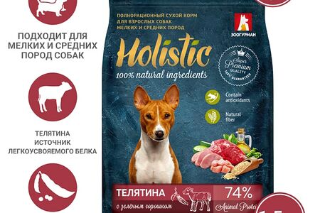 Сухой корм для собак мелких и средних пород Зоогурман Holistic Телятина с зеленым горошком 1.5кг - полноценный рацион из новой линейки сухих кормов Holistic, основанной на природных потребностях вашего питомца. Легкоусвояемые источники животного протеина, овощи, ягоды, фрукты, полезные травы, исключительно натуральные добавки, богатые витаминами и клетчаткой цельные злаки – это компоненты рационов Holistic. Чистый состав данной линейки обеспечивает её многогранные профилактические свойства. Благодаря натуральным добавкам и легкоусвояемым ингредиентам питомцы будут более устойчивы к возникновению распространенных заболеваний.