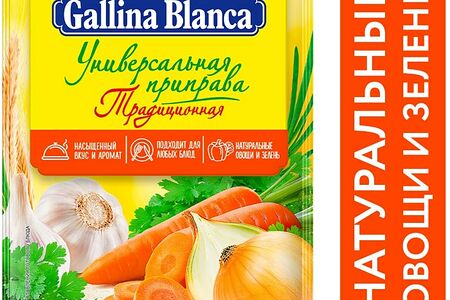 Приправа Gallina Blanca Универсальная традиционная 75г идеально подходит для первых и вторых блюд. Производится по оригинальной рецептуре с добавлением свежих овощей, подсолнечного масла, соли и ароматных специй. Не содержит консервантов и ГМО. Эта универсальная смесь придаст приятный аромат и насыщенный вкус любым блюдам из овощей, мяса, рыбы, риса и макарон. Добавлять ее рекомендуется за 5 минут до конца приготовления. Gallina Blanca широко известный бренд, предлагающий богатый ассортимент бульонных кубиков, приправ, супов, соусов и пасты. Основные приоритеты производителя: высокое качество продукции, ответственное отношение к потребителям и забота об экологии. Специалисты компании используют деликатный метод высушивания, позволяющий сохранить натуральный вкус и полезные свойства ингредиентов.