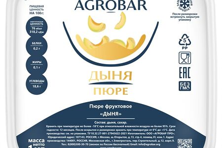 Сведения о составе: Дыня, сахарПищевая ценность: 76,0.2,0.1,18.6Условия хранения: -18,-18Срок годности в днях: 365Страна изготовления: РоссияСведения об упаковке: Пластиковая упаковкаПроизводитель: Агробар про