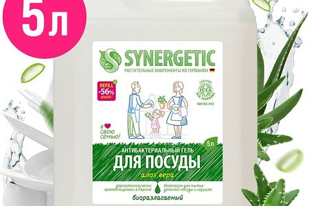 Средство для мытья посуды Synergetic Алоэ 5л - это экологичный, гипоаллергенный и эффективный концентрированный гель. Благодаря биоразлагаемым тензидам продукт хорошо пенится, устраняет любой жир и запахи. Подходит для нежной и чувствительной кожи рук, так как в составе находится растительный глицерин, защищающий от сухости и раздражения. Прозрачный гель обладает деликатным приятным ароматом, в основе которого лежат эфирные масла аира, гальмануба, мяты, шалфея, лемонграсса и муската. У средства есть международный сертификат Итальянского института этической и экологической сертификации ICEA. Его можно использовать для мытья посуды, овощей, детских принадлежностей и игрушек.