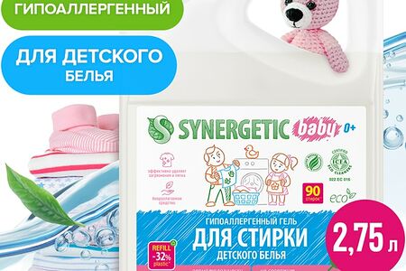 Гель для стирки Synergetic для детского белья 2.75л - экологичное и эффективное средство для стирки. В составе содержатся мягкие биоразлагаемые растительные тензиды, органическое мыло и зеленые хелаты. Благодаря этому уникальному комплексу гель на 100% вымывается из волокон ткани и справляется с любыми стойкими загрязнениями. Отсутствуют отдушки и красители, за счет чего его можно использовать для стирки вещей с самого рождения ребенка. Продукт имеет сертификат международного института этической и экологической сертификации ICEA. Безопасен для детей, домашних животных и людей с чувствительной кожей. Подходит для ручной и машинной стирки при 20-90 градусах, сохраняет яркость и прочность вещей. Экономичная упаковка из перерабатываемого пластика оборудована складным носиком, что облегчает наливание.