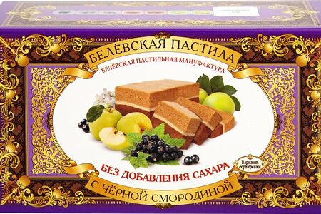 Сведения о составе: Яблки, черная смородина, яичный белокПищевая ценность: 276,4,0,65Условия хранения: 21,8Срок годности в днях: 365Страна изготовления: РоссияСведения об упаковке: Картонная упаковкаПроизводитель: Белёвская пастила