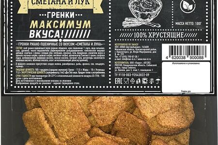 Сведения о составе: Хлеб ржано-пшеничный (мука ржаная обдирная, мука пшеничная 1 сорта, вода питьевая, соль, дрожжи), масло подсолнечное рафинированное дезодорированное, комплексная пищевая добавка «сметана с луком» (специи (лук, петрушка, куркума), соль поваренная, усилители вкуса и аромата глутамат натрия, гуанилат натрия, инозинат натрия, ароматизатор Сметана с луком, сахарная пудра, антиокислители лимонная кислота, винная кислота, экстракт лука, регуляторы кислотности молочная кислота, яблочная кислота, краситель жёлтый хинолиновый, агент антислеживающий диоксид кремния). В продукте возможно присутствие следов молока, ракообразных, рыбы, арахиса, сои, сельдерея, горчицы.Пищевая ценность: 346,11.5,18,71Условия хранения: 22,20Срок годности в днях: 180Страна изготовления: РоссияСведения об упаковке: ЛотокПроизводитель: Парус