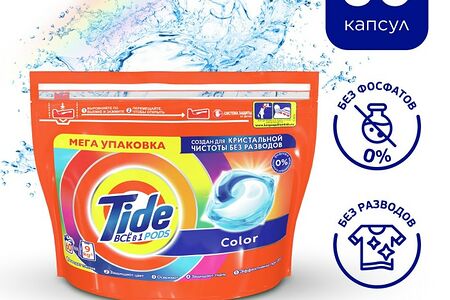 Капсулы для стирки Tide Все в 1 PODs 60шт - это инновационное средство для очищения одежды и белья, состоящее из 3 секций, в каждой из которых находятся отдельные компоненты. При контакте с водой во время стирки инновационная пленка капсулы растворяется и ингредиенты смешиваются, начиная сразу действовать. Точная дозировка позволяет отстирать целый барабан вещей всего одной капсулой. Специальная формула быстро действует, удаляя загрязнения, очищает даже стойкие пятна и сохраняет яркость цвета стирка за стиркой. Капсулы легко использовать, ведь ничего не нужно дозировать. Подходят для стирки даже в холодной воде от 20 °С. Не содержат кондиционер для белья. Все активные компоненты полностью биоразлагаемы.