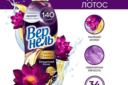 Концентрированный кондиционер для белья "Вернель Ароматерапия Загадочный лотос" 870 мл (34 стирки) подарит вашему белью не только невероятную мягкость, но и магический аромат лотоса, а благодаря специальным аромакапсулам в составе кондиционер для стирки "Вернель" позволит наслаждаться интенсивным ароматом белья до 140 дней. Преимущества кондиционера для белья "Вернель": кондиционер для белья обеспечивает аромат до 140 дней (при хранении белья без использования); кондиционер содержит в составе эфирные масла, дарящие вдохновение для души и тела; кондиционер для стирки придает приятный аромат и мягкость белью; кондиционер для стирки облегчает глажку и обладает антистатическим эффектом; дарит чувственный яркий аромат черной орхидеи с яркими оттенками пачули; на одну стирку достаточно меньше половины колпачка. Подходит для всех видов тканей. Избегайте непосредственного контакта средства для стирки с тканью.