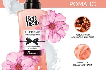 Концентрированный кондиционер для белья "Вернель Супрэм Романс" 600 мл (20 стирок) создан совместно с французскими парфюмерами и обладает элегантным сочетанием аромата роз, белых цветов и цитрусовых нот, которые придадут изысканный аромат вашему белью. Кондиционер для стирки содержит миллионы разглаживающих частиц для роскошной мягкости и заботы о ткани. Вместе с кондиционером для белья "Вернель Супрэм Романс" окутайте себя изысканным французским ароматом и перенеситесь в атмосферу Парижа. Преимущества кондиционера для белья "Вернель": средство "Вернель" имеет уникальную Creme-care формулу, обеспечивающую мягкость белью. Благодаря специальным аромакапсулам в составе кондиционер дарит элегантное сочетание цветочных ароматов. Кондиционер для стирки облегчает глажку и обладает антистатическим эффектом. Кондиционер "Вернель" идеально подходит для регулярного ухода за бельем благодаря эффективности и простоте использования. На одну стирку достаточно меньше половины колпачка средства "Вернель".