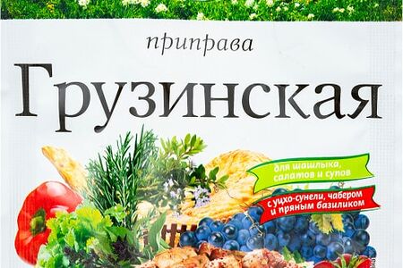 Сведения о составе: Соль морская, кориандр, уцхо-сунели, паприка, куркума, базилик, орегано, майоран, чабер, перец черный, петрушка, укроп, мята, перец красный, сельдерейПищевая ценность: 213,7.5,11,18.4Условия хранения: 20,0Срок годности в днях: 730Страна изготовления: РоссияСведения об упаковке: ПакетПроизводитель: Проммикс